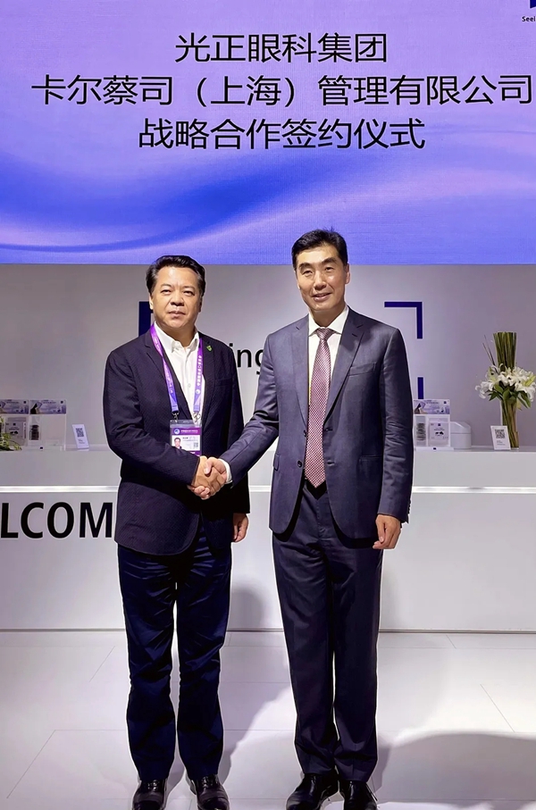 2020年11月8日,第三届中国国际进口博览会上,光正眼科集团与卡尔蔡司(上海)管理有限公司签署战略合作协议。光正眼科集团董事长周永麟先生,卡尔蔡司(上海)管理有限公司大中华区总裁刘永华先生参加了签约仪式。通过本次合作,双方将积极发挥各自的优势,秉承“优势互补、长期合作、互利共赢”的原则,践行“健康中国”理念,共同推动我国眼健康事业的发展。
