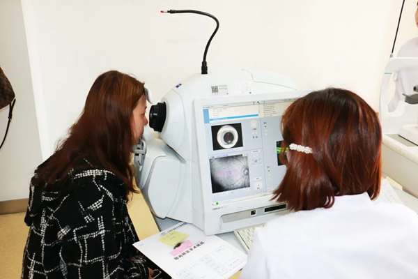 🔼 图为新视界眼科工作人员使用蔡司OCTA(光学相干断层扫描血管成像)为患者进行眼底检查