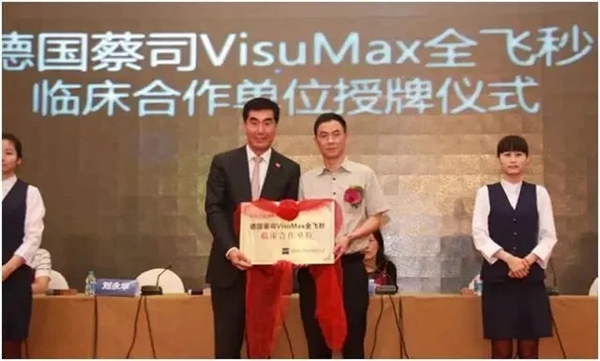 🔼 图为2013年5月25日, 全飞秒落户上海新闻发布会,德国蔡司大中华区总裁刘永华先生将“德国蔡司VisuMax全飞秒临床合作单位”铜牌颁发给上海新视界眼科医院。